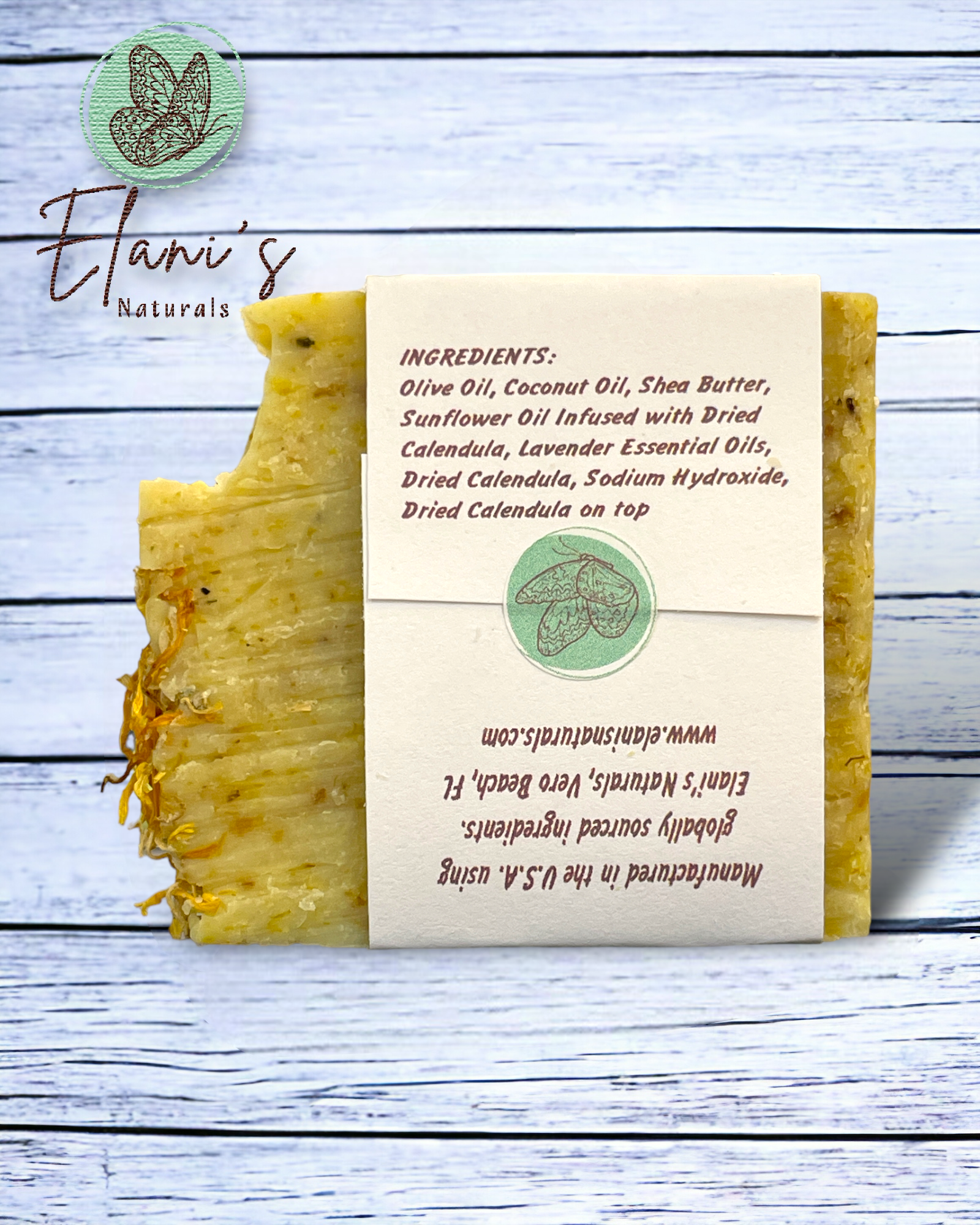 INGREDIENTS: Olive Oil, Coconut Oil, Shea Butter, Sunflower Oil Infused with Dried Calendula, Lavender Essential Oils, Dried Calendula, Sodium Hydroxide, Dried Calendula on top