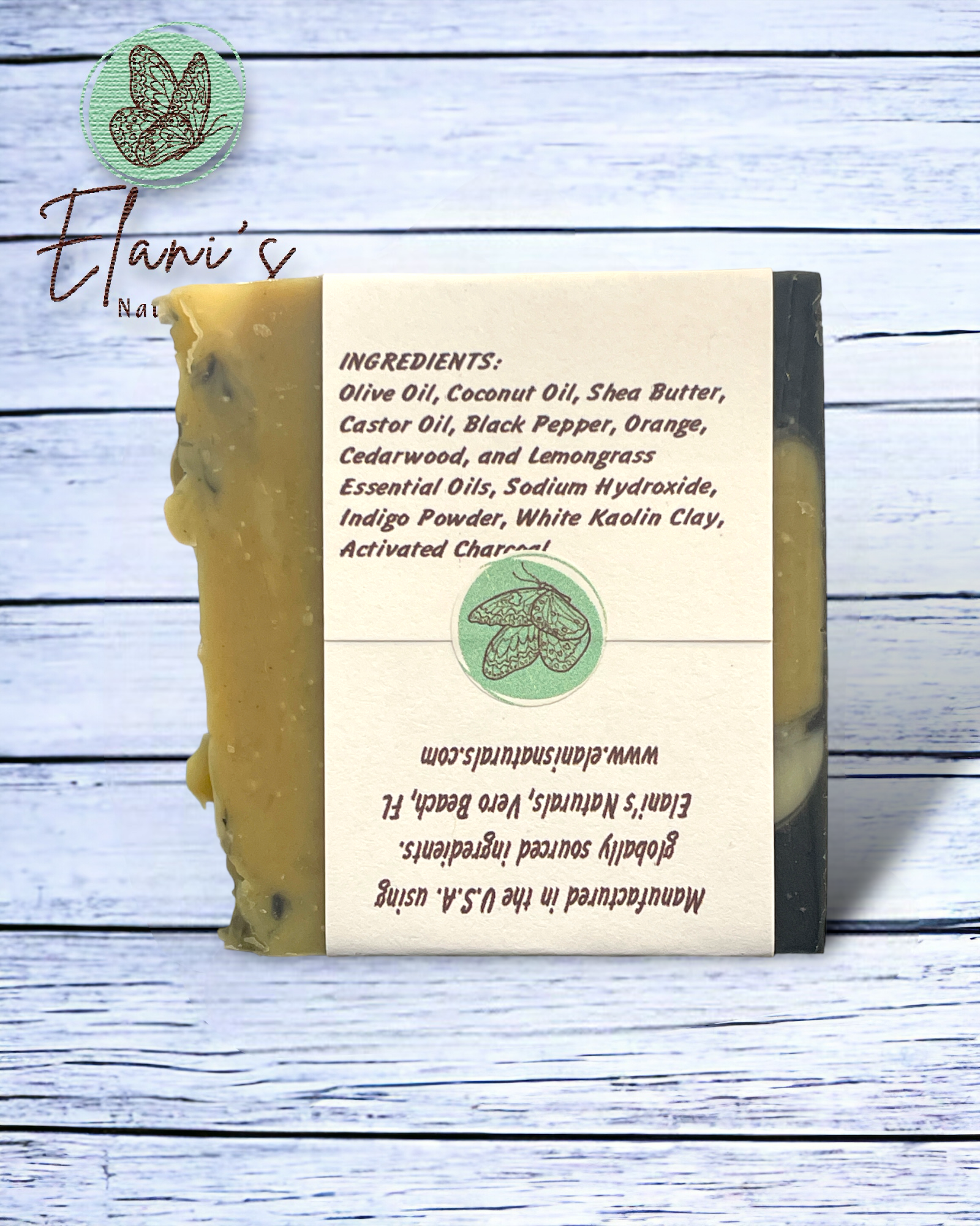 INGREDIENTS: Olive Oil, Coconut Oil, Shea Butter, Castor Oil, Black Pepper, Orange, Cedarwood, and Lemongrass Essential Oils, Sodium Hydroxide, Indigo Powder, White Kaolin Clay, Activated Charcoal