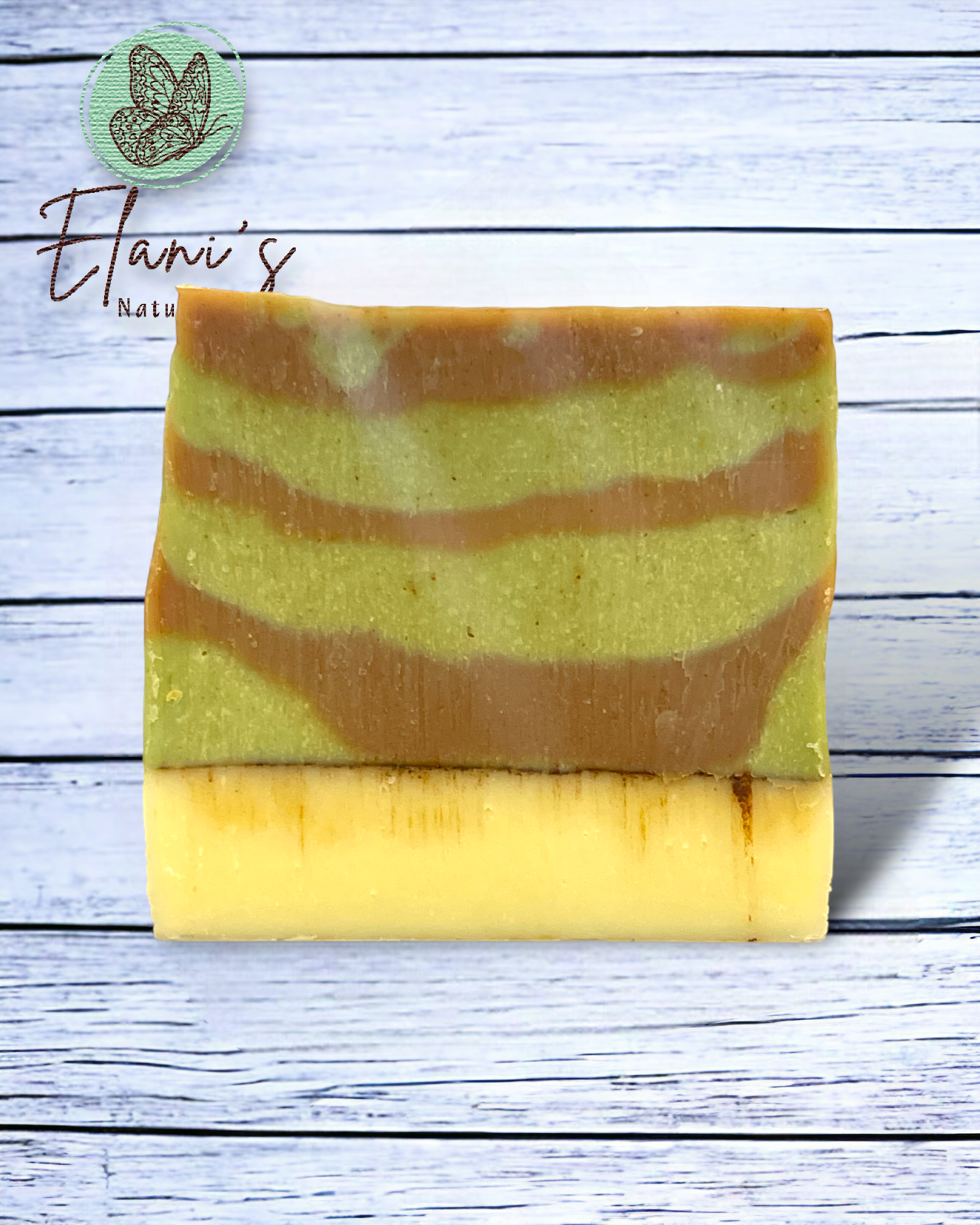 The layered visual appeal of this soap is a testament to nature's palette: soft hues of light brown and mint green, accentuated by a rich line of cocoa powder and a delicate white-yellow base. Ingredients like paprika and green kaolin clay naturally infuse these colors, further enhancing the soap's artisanal charm.