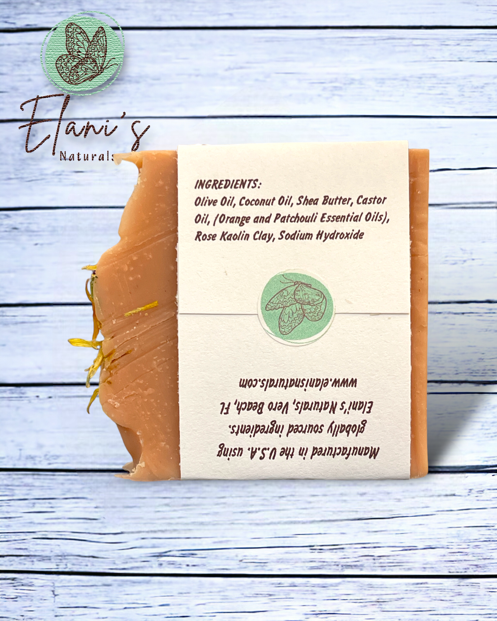INGREDIENTS: Olive Oil, Coconut Oil, Shea Butter, Castor Oil, (Orange and Patchouli Essential Oils), Rose Kaolin Clay, Sodium Hydroxide