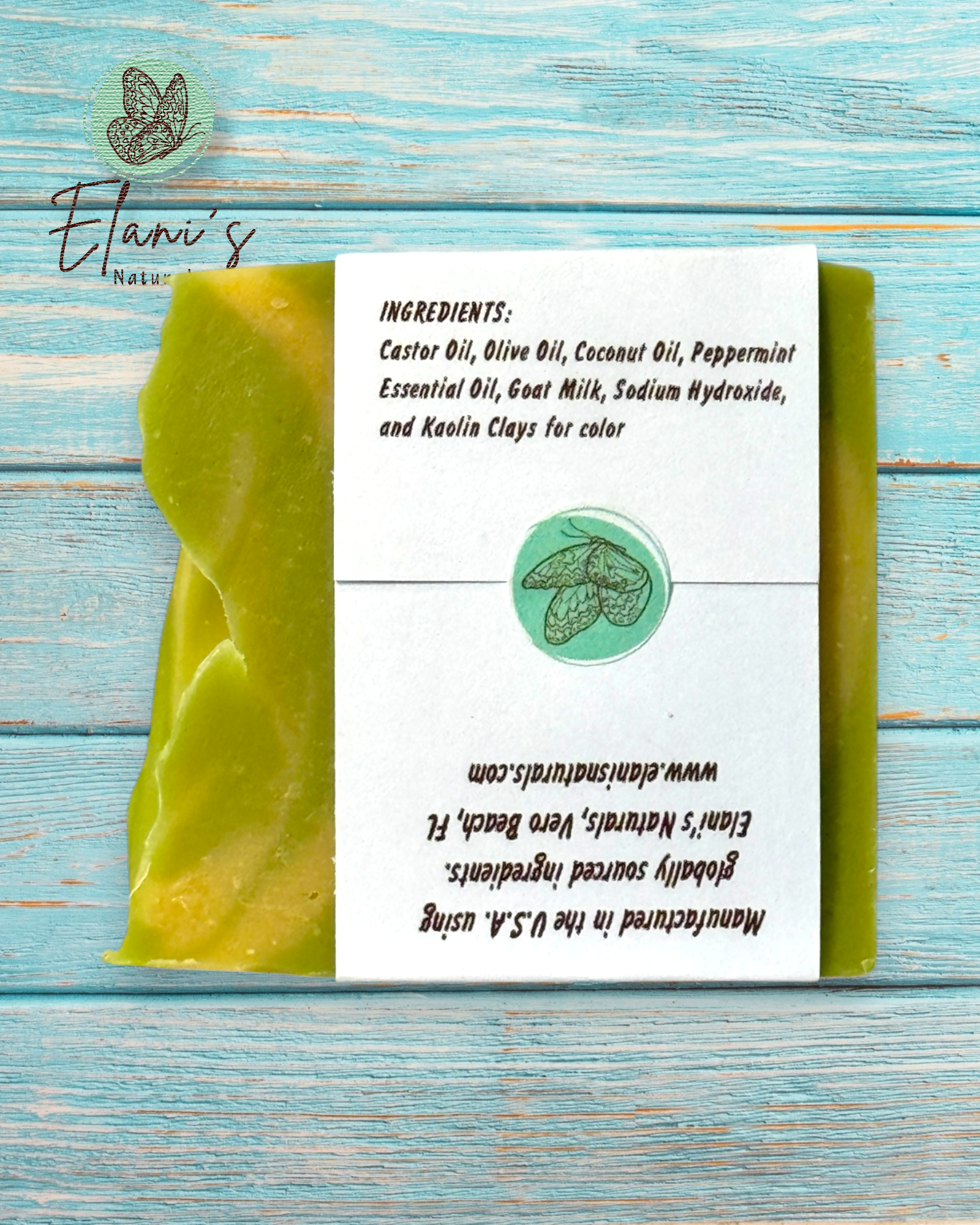 INGREDIENTS: Castor Oil, Olive Oil, Coconut Oil, Peppermint Essential Oil, Goat Milk, Sodium Hydroxide, and Kaolin Clays for color