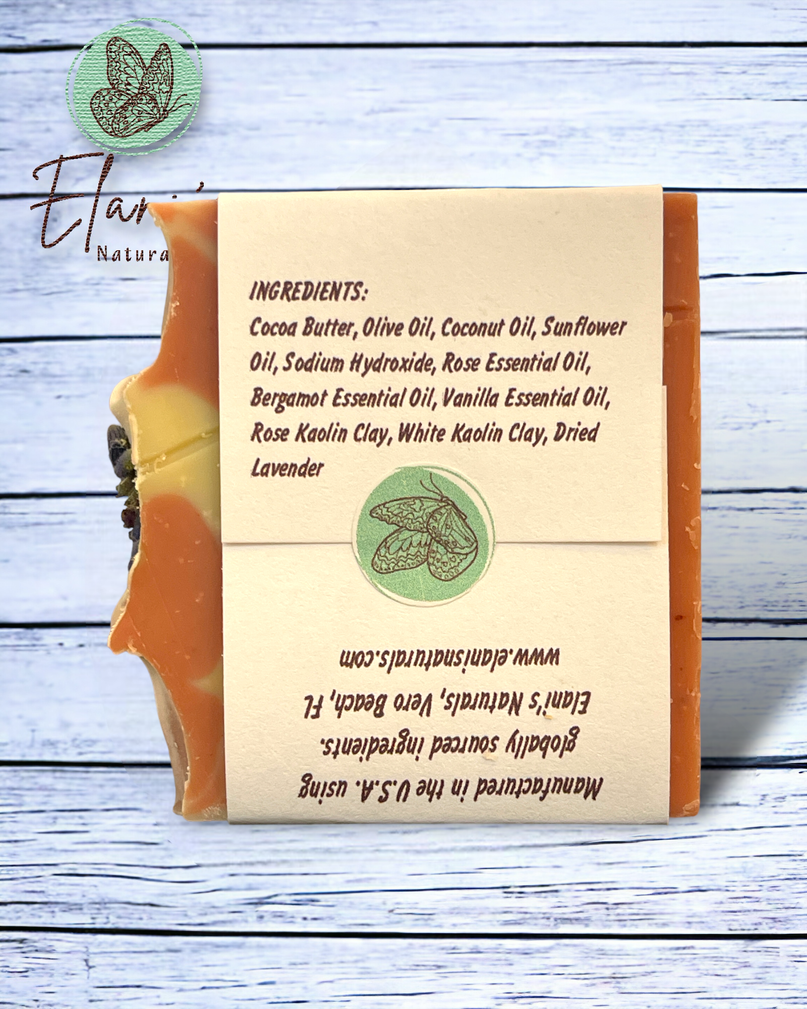 INGREDIENTS: Cocoa Butter, Olive Oil, Coconut Oil, Sunflower Oil, Sodium Hydroxide, Rose Essential Oil, Bergamot Essential Oil, Vanilla Essential Oil, Rose Kaolin Clay, White Kaolin Clay, Dried Lavender